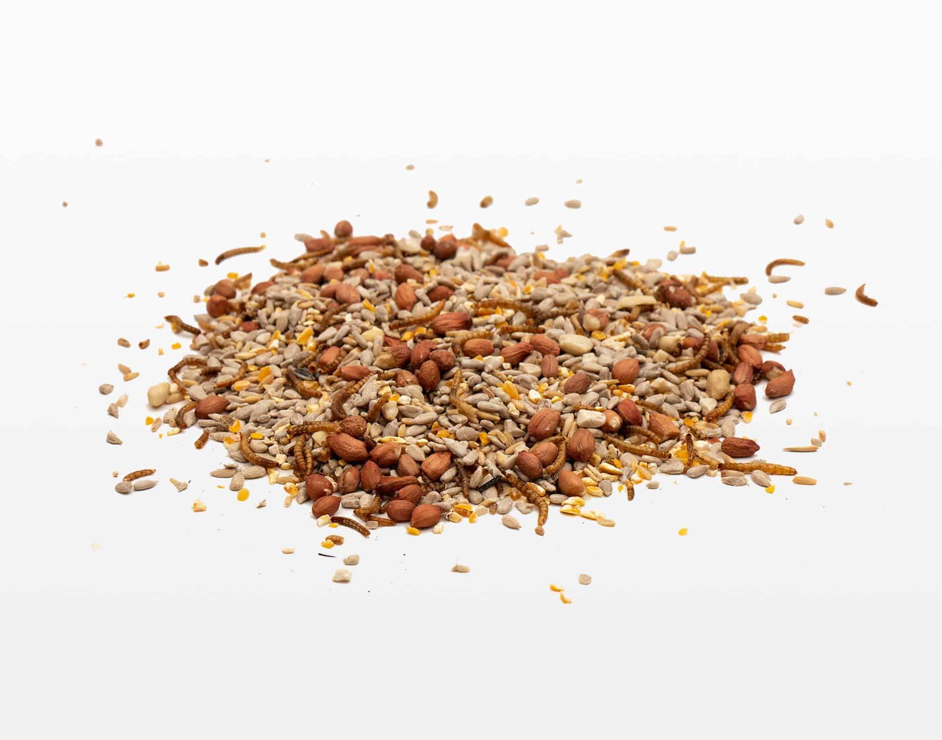De meeste vogels zullen door de reeds gepelde zaden en premium gedroogde meelwormen direct op de voederplek gaan eten en hoeven de zaden niet mee te nemen naar een rustig plekje om ze te pellen. Dit premium strooivoer kan gebruikt worden als strooivoer maar is bij uitstek geschikt voor een voederhuisje of silo.