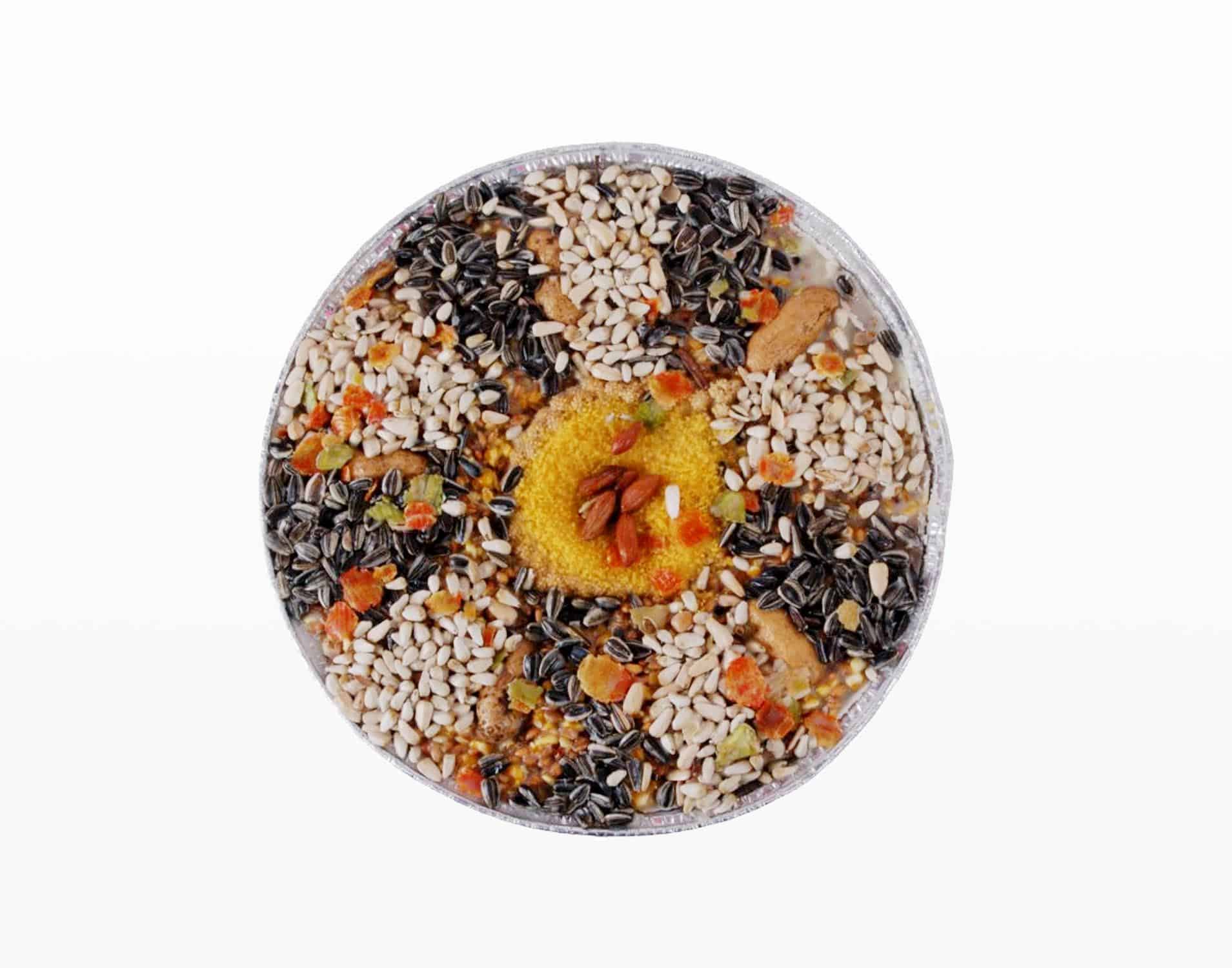 De vogelpizza is rijkelijk gevuld met zaden, noten, granen, vruchten en vet.